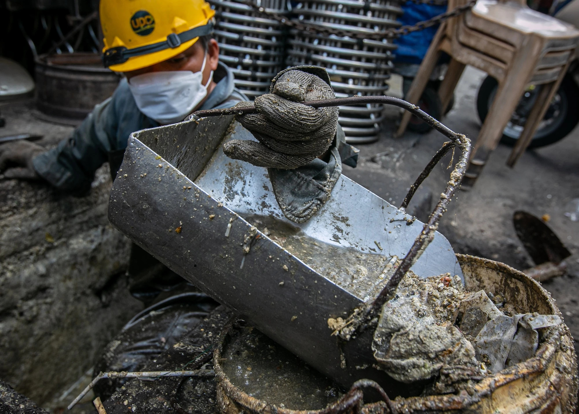 Bước 2: Sắn sàng, để đảm bảo vệ sinh bạn cần đeo kỹ găng tay, bịt khẩu trang và hứng chậu tại cửa thải của bể. Sau đó tháo kết nói đường ống với đầu thải bằng cờ lê mỏ lết và bẻ nghiên góc 30 độ cho phần nước trong bể tách mỡ chảy vào chậu. Phần còn lại là các chất lắng cặn.