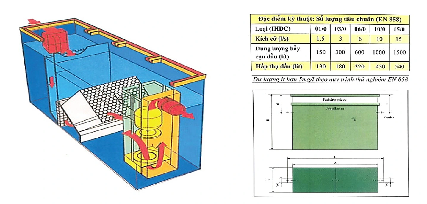 Thiết bị tách dầu rất lý tưởng cho các ứng dụng tách hidrocacbon tự do, hoặc để sử dụng với các nhũ tương thể yếu. Những thiết bị tách dầu này được sản xuất theo tiêu chuẩn Châu Âu được áp dụng rộng rãi, EN 858 hoặc các chỉ dẫn kỹ thuật hiện hành tại Việt Nam. Đặc điểm kỹ thuật của thiết bị liên quan cụ thể tới kết quả tách dầu từ hỗn hợp nước ở nhiệt độ 20oC.