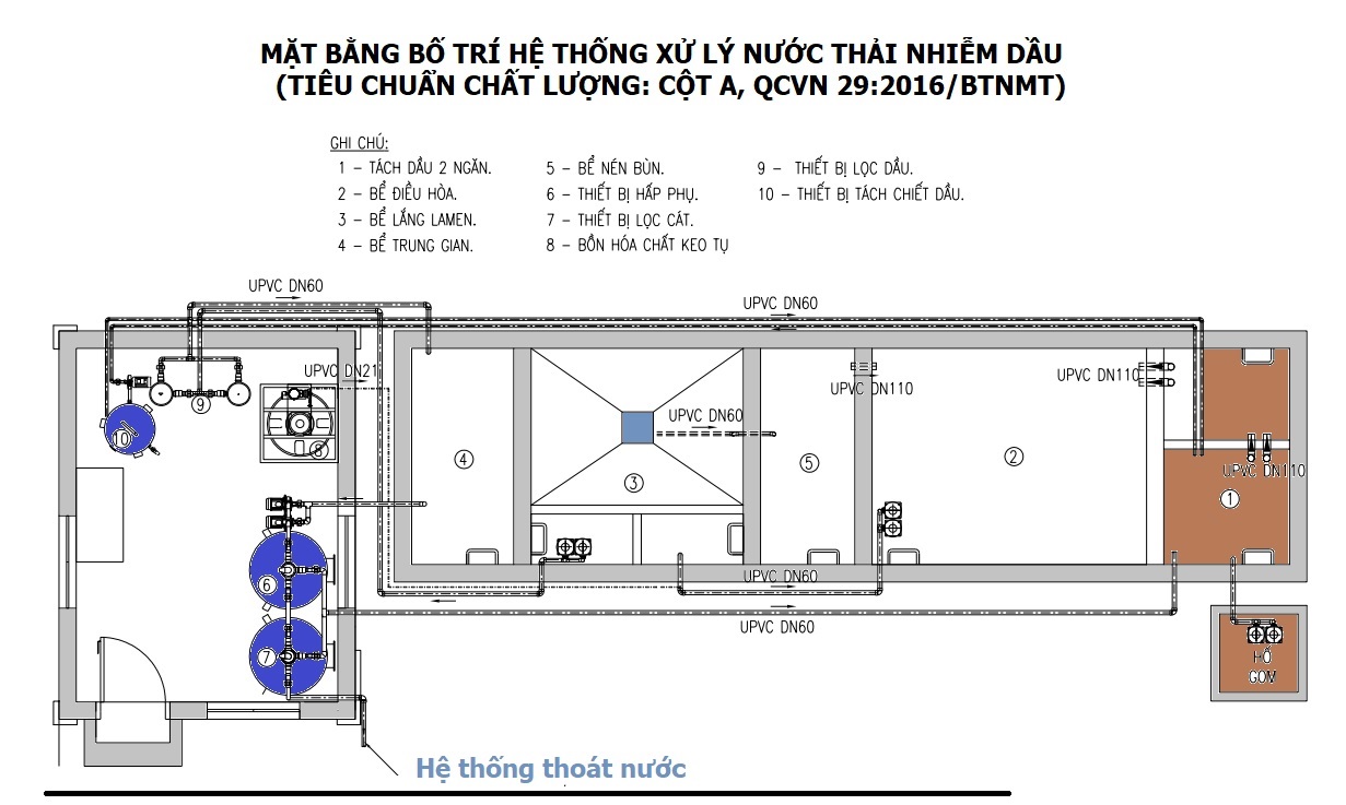 + Chức năng chính: Thu gom, lắng đọng chất rắn, tách dầu mỡ, điều hòa lưu lượng, xử lý chất hữu cơ, kim loại nặng và khử trùng.