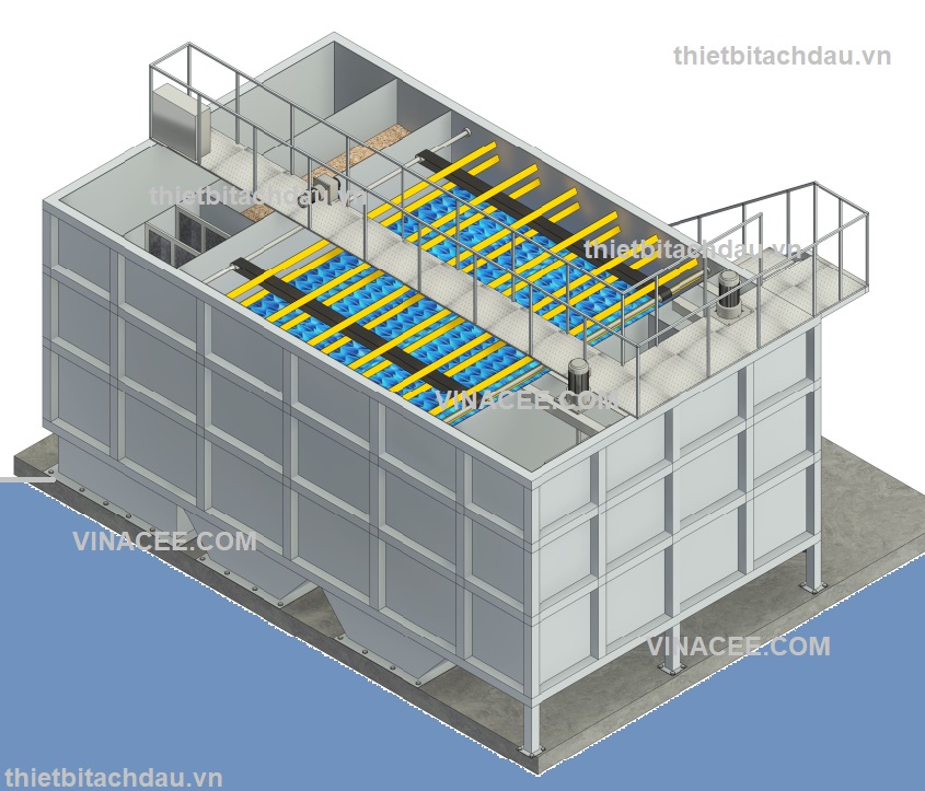 Nước thải nhiễm dầu sau đó được chảy qua ngăn lắng lamen. Tại đây có bố trí các tấm lắng nghiêng giúp rút ngắn thời gian lắng, tách nhanh bông bùn và dầu nổi. Cặn lắng xuống đáy được thu gom định kỳ. Dầu nhẹ nổi lên mặt nước được đưa về ngăn thu dầu.