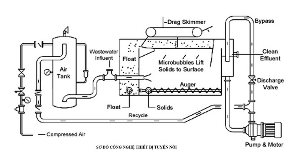 Hỗn hợp nước thải và không khí sau đó chuyển qua ngăn tuyển nổi, van giảm áp suất để chuyển từ áp suất nội bộ sang áp suất khí quyển một cách đột ngột.