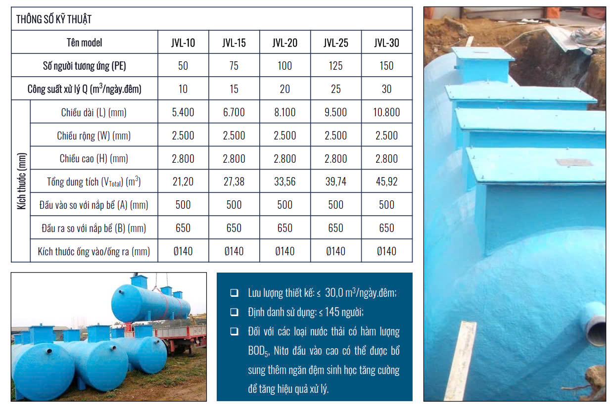 Công suất: có thể áp dụng cho các quy mô khác nhau, từ 1,5 đến 500 m3/ngày